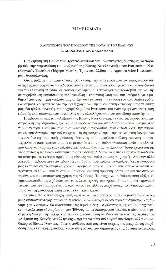 , «Σημειώματα. Χαιρετισμός του Προέδρου της Βουλής των Ελλήνων κ. Απόστολου Χρ. Κακλαμάνη», Φιλόλογος, τχ. 95 (Άνοιξη 1999), σ. 13-14