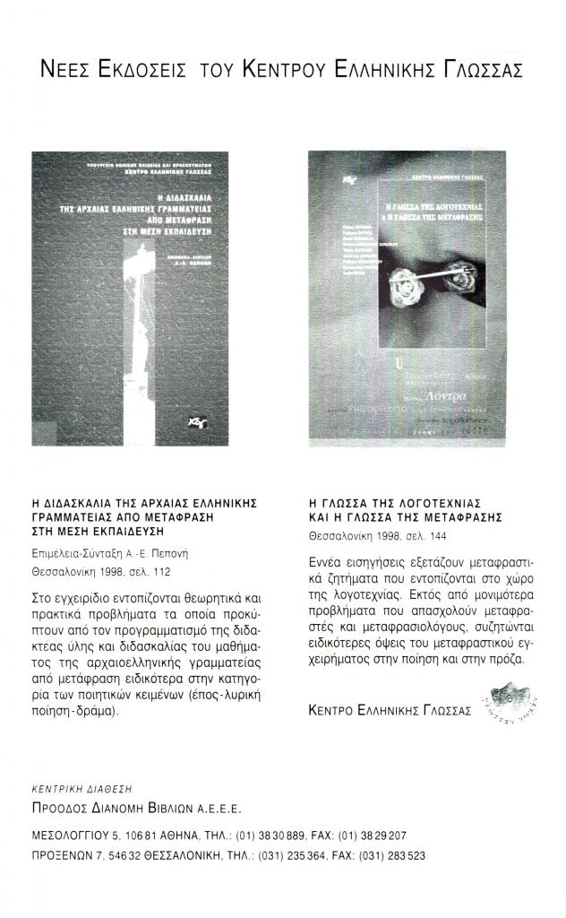 «Νέες εκδόσεις του Κέντρου Ελληνικής Γλώσσας. Η διδασκαλία της αρχαίας ελληνικής γραμματείας από μετάφραση στη μέση εκπαίδευση. Η γλώσσα της λογοτεχνίας και η γλώσσα της μετάφρασης», Φιλόλογος, τχ. 95 (Άνοιξη 1999), σ. (έσω οπισθόφυλλο)