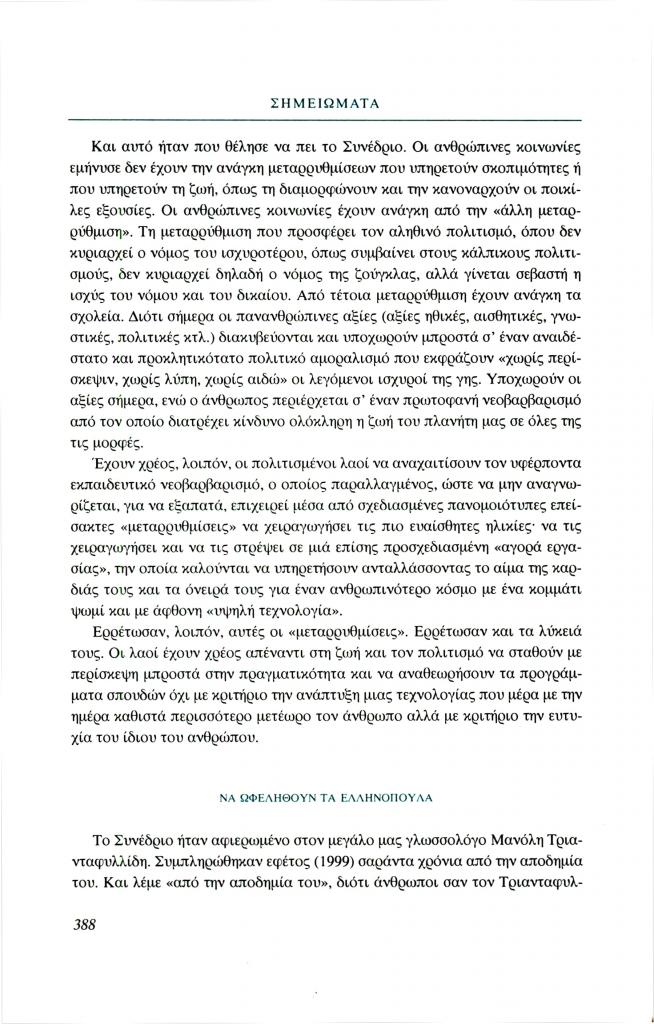 (ανυπόγραφο), «Σημειώματα. Να ωφεληθούν τα ελληνόπουλα», Φιλόλογος, τχ. 98 (Χειμώνας 1999), σ. 388-390