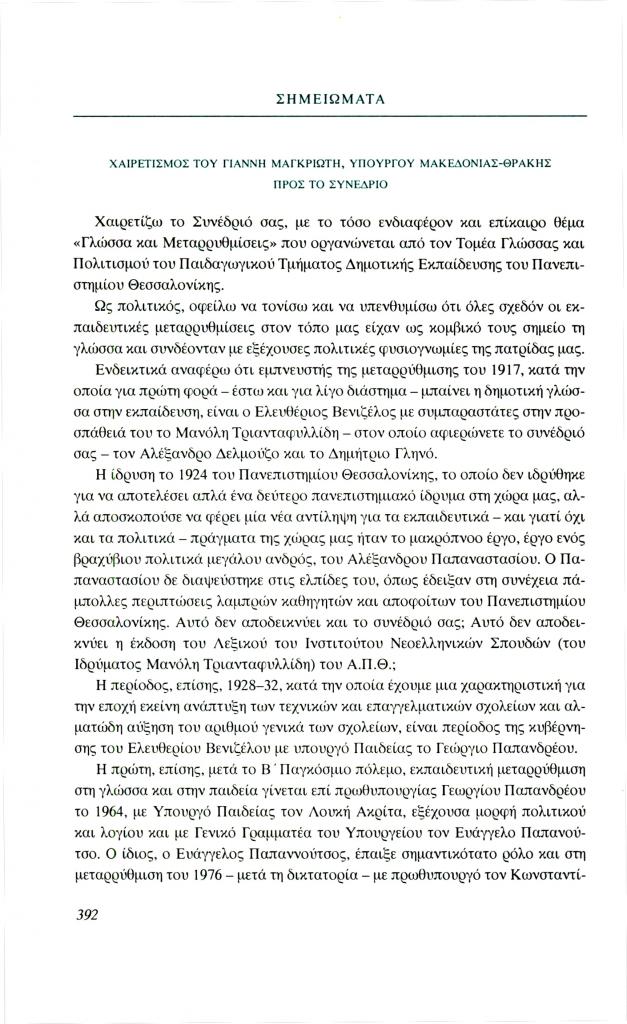 Μαγκριώτης Γιάννης, «Σημειώματα. Χαιρετισμός του Γιάννη Μαγκριώτη, Υπουργού Μακεδονίας-Θράκης προς το Συνέδριο», Φιλόλογος, τχ. 98 (Χειμώνας 1999), σ. 392-393