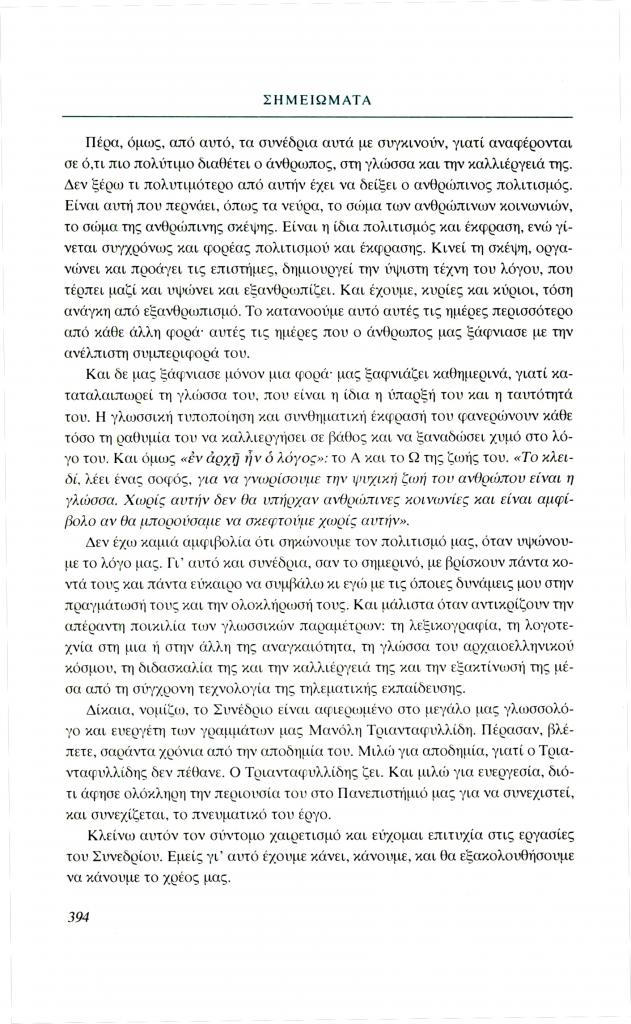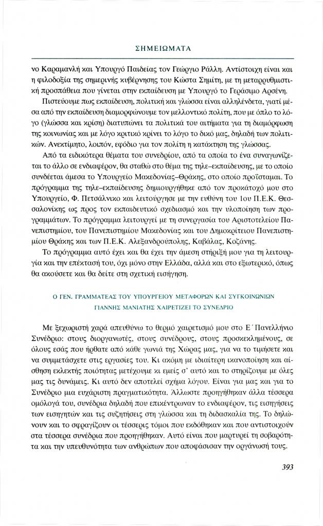 Μανιάτης Γιάννης, «Σημειώματα. Ο Γεν. Γραμματέας του Υπουργείου Μεταφορών και Συγκοινωνιών Γιάννης Μανιάτης χαιρετίζει το Συνέδριο», Φιλόλογος, τχ. 98 (Χειμώνας 1999), σ. 393-394