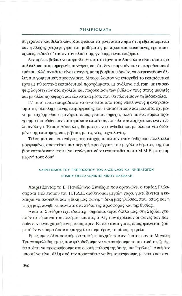 , «Σημειώματα. Χαιρετισμός του εκπροσώπου των δασκάλων και νηπιαγωγών νομού Θεσσαλονίκης Νίκου Φασφαλή», Φιλόλογος, τχ. 98 (Χειμώνας 1999), σ. 396-397