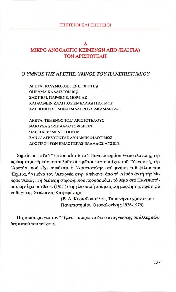 , «Επέτειοι και επέτειοι. Δ. Μικρό ανθολόγιο κειμένων από (και για) τον Αριστοτέλη. Ο Ύμνος της Αρετής: Ύμνος του Πανεπιστημίου», Φιλόλογος, τχ. 100 (Καλοκαίρι 2000), σ. 137