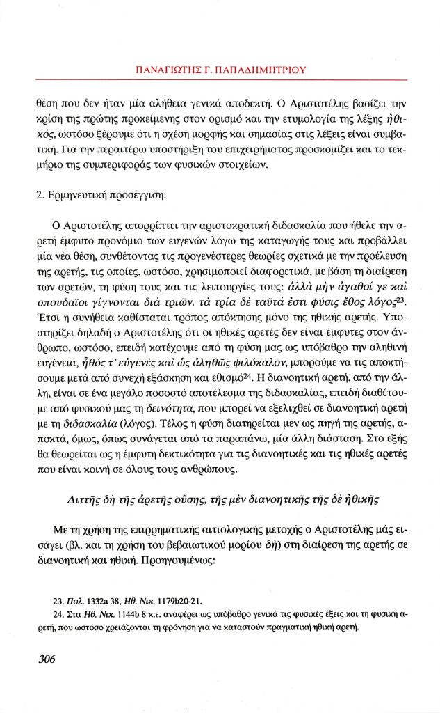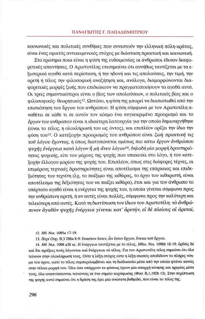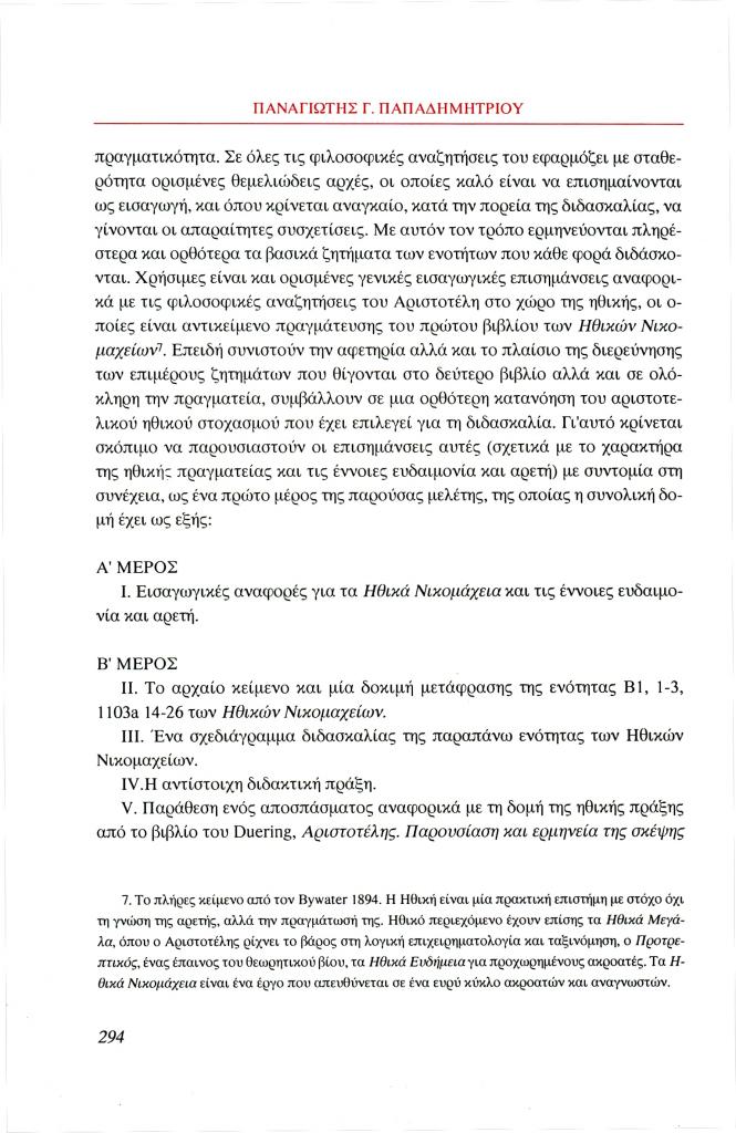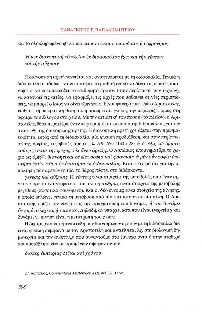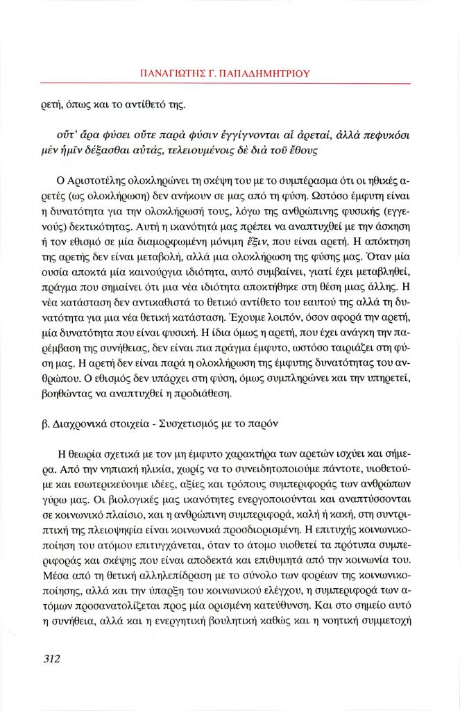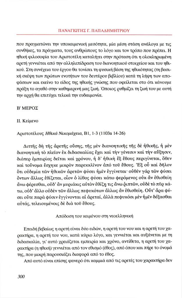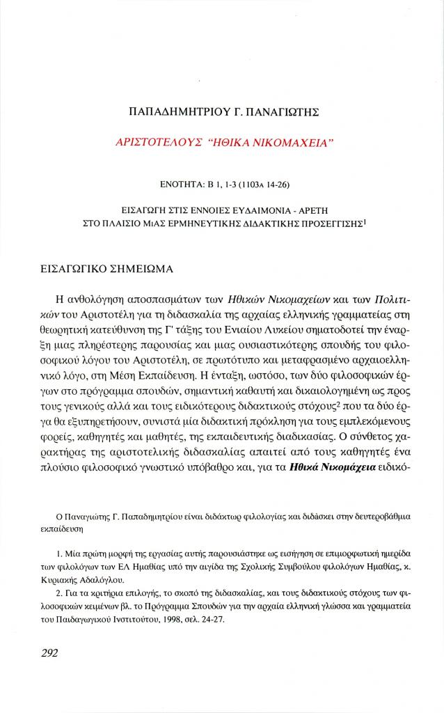 Παπαδημητρίου Παναγιώτης Γ., «Αριστοτέλους Ηθικά Νικομάχεια. Ενότητα: Β 1, 1-3 (1103Α 14-26). Εισαγωγή στις έννοιες ευδαιμονία – αρετή στο πλαίσιο μιας ερμηνευτικής διδακτικής προσέγγισης», Φιλόλογος, τχ. 100 (Καλοκαίρι 2000), σ. 292-317
