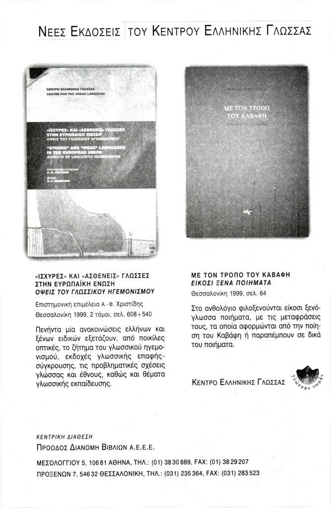 «Νέες εκδόσεις του Κέντρου Ελληνικής Γλώσσας. Ισχυρές και ασθενείς γλώσσες στην Ευρωπαϊκή Ένωση. Όψεις του γλωσσικού ηγεμονισμού. Με τον τρόπο του Καβάφη. Είκοσι ξένα ποιήματα», Φιλόλογος, τχ. 100 (Καλοκαίρι 2000), σ. 350