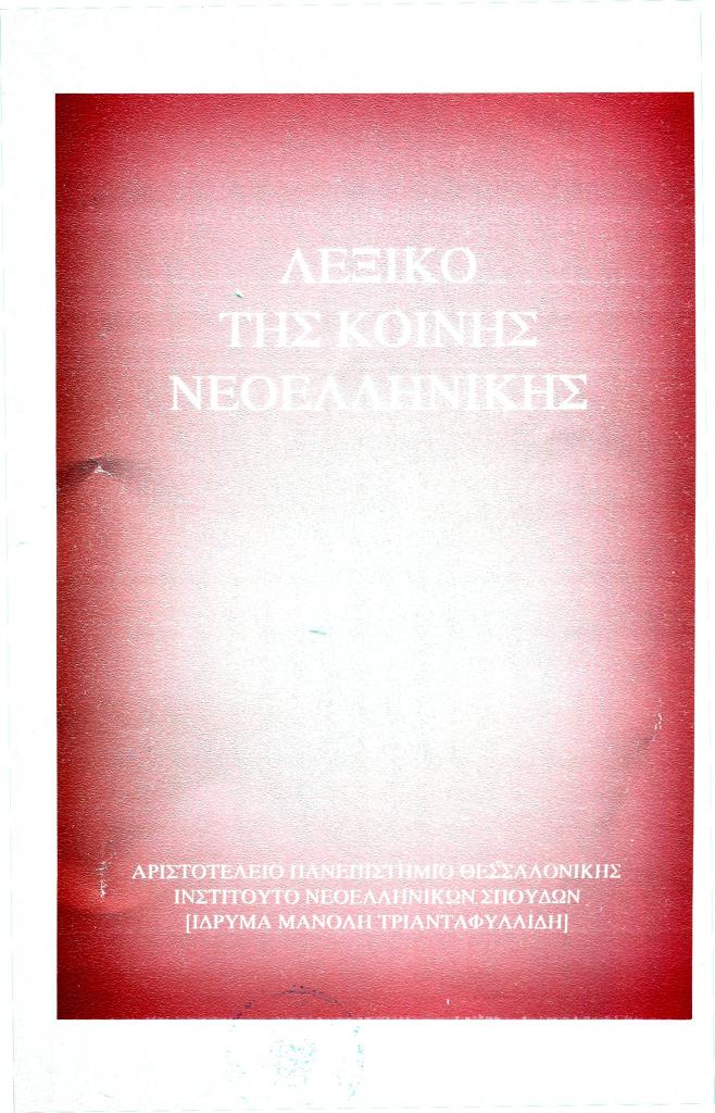 «Λεξικό της κοινής νεοελληνικής. Αριστοτέλειο Πανεπιστήμιο Θεσσαλονίκης Ινστιτούτο Νεοελληνικών Σπουδών (Ίδρυμα Μανόλη Τριανταφυλλίδη)», Φιλόλογος, τχ. 100 (Καλοκαίρι 2000), σ. (έσω οπισθόφυλλο)