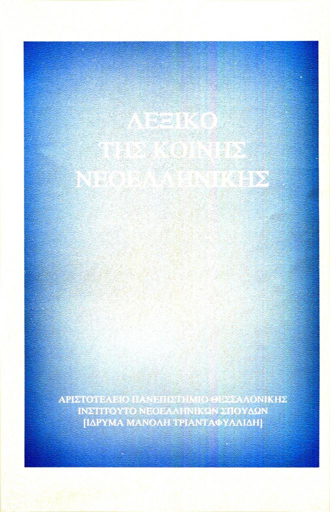 «Λεξικό της κοινής νεοελληνικής. Αριστοτέλειο Πανεπιστήμιο Θεσσαλονίκης Ινστιτούτο Νεοελληνικών Σπουδών (Ίδρυμα Μανόλη Τριανταφυλλίδη)», Φιλόλογος, τχ. 99 (Άνοιξη 2000), σ. (έσω οπισθόφυλλο)