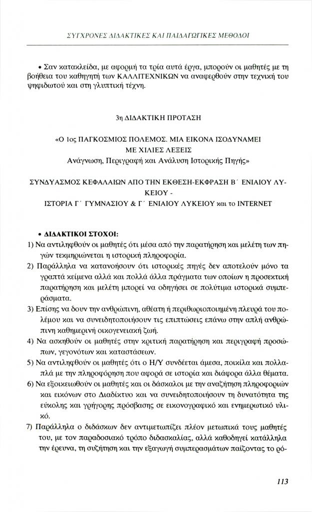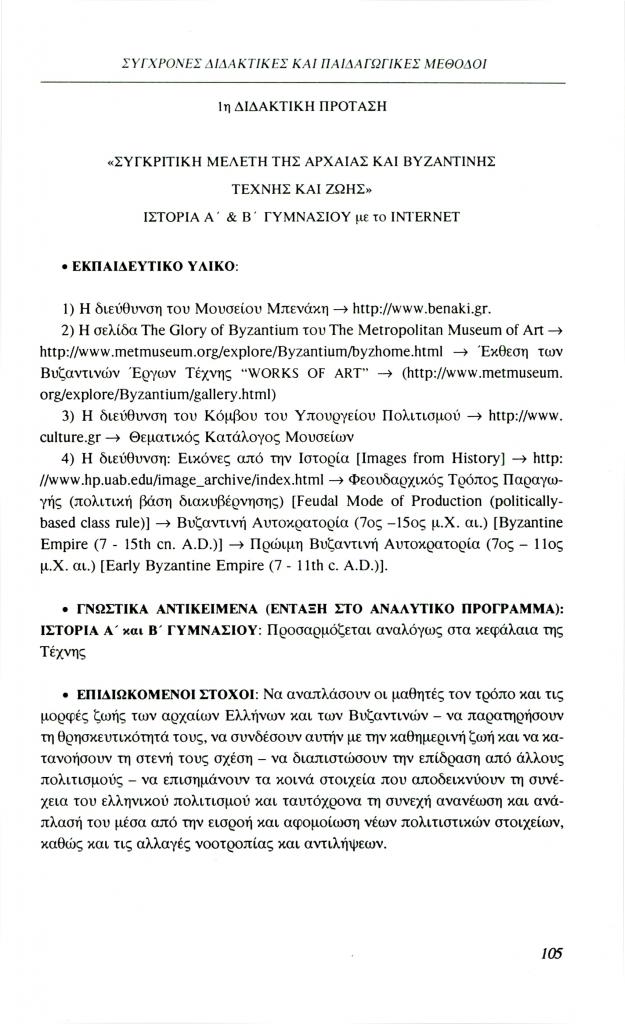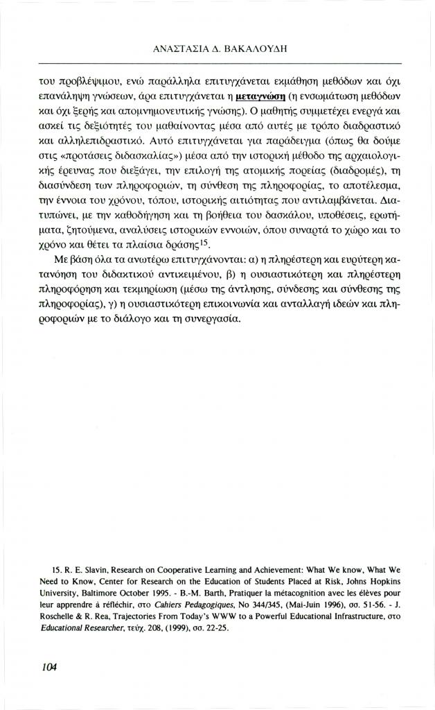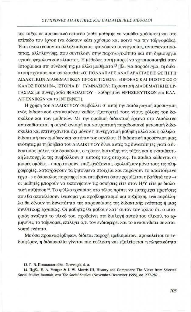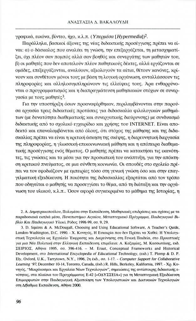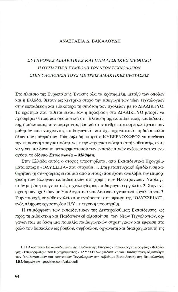 , «Σύγχρονες διδακτικές και παιδαγωγικές μέθοδοι. Η ουσιαστική συμβολή των νέων τεχνολογιών στην υλοποίησή τους με τρεις διδακτικές προτάσεις», Φιλόλογος, τχ. 103 (Άνοιξη 2001), σ. 94-117