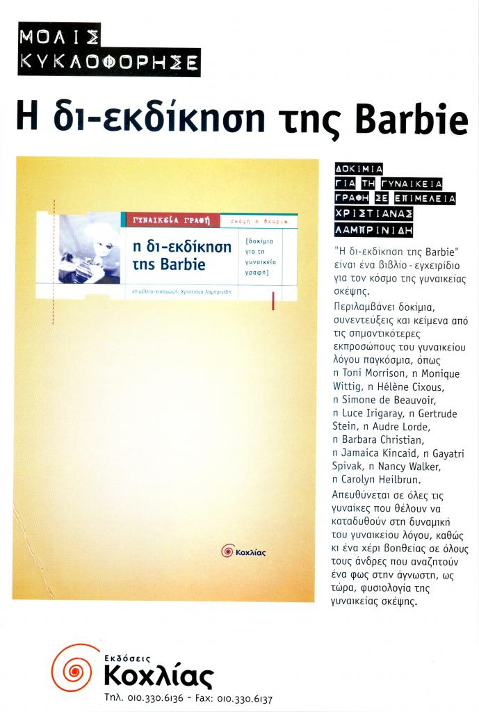 «Η δι-εκδίκηση της Barbie [Δοκίμια για τη γυναικεία γραφή], επιμέλεια – εισαγωγή: Χριστιάνα Λαμπρινίδη, Κοχλίας», Φιλόλογος, τχ. 108 (Καλοκαίρι 2002), σ. (εσώφυλλο)