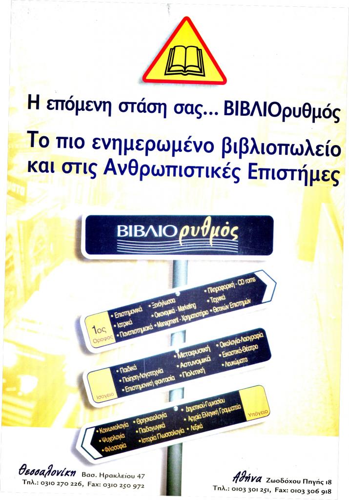 «Βιβλιορυθμός. Το πιο ενημερωμένο βιβλιοπωλείο και στις Ανθρωπιστικές Επιστήμες», Φιλόλογος, τχ. 108 (Καλοκαίρι 2002), σ. (οπισθόφυλλο)