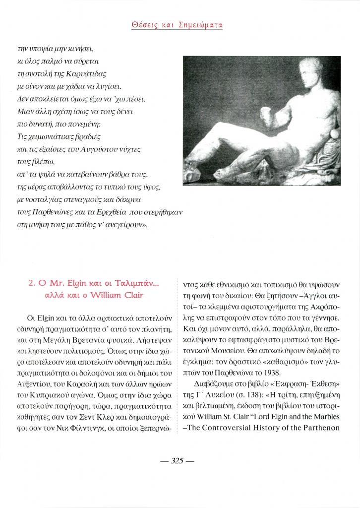 , «Θέσεις και σημειώματα. Α. Πάντα πλήρη θεών 2. Ο Mr. Elgin και οι Ταλιμπάν… αλλά και ο William Clair», Φιλόλογος, τχ. 109 (Φθινόπωρο 2002), σ. 325-327