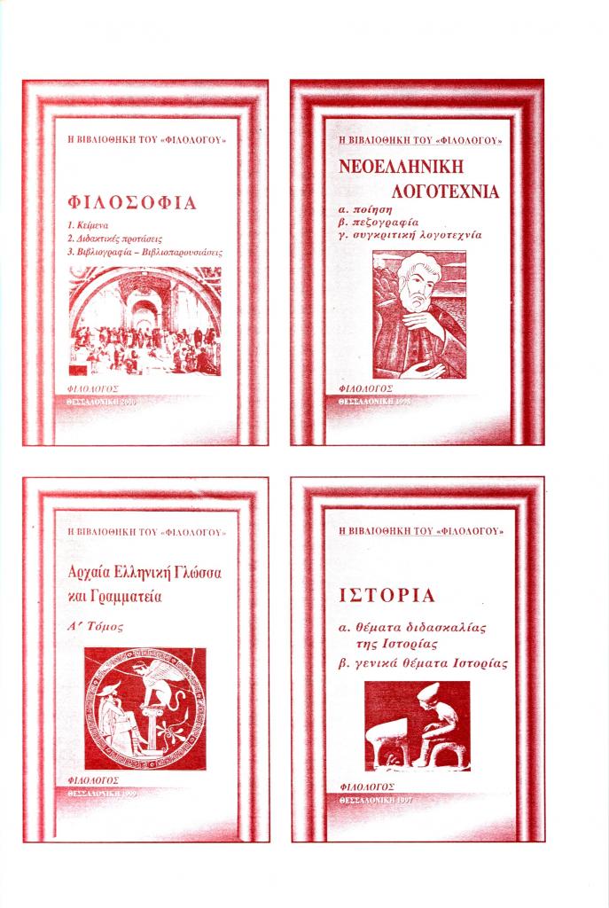 «Η βιβλιοθήκη του Φιλολόγου. Φιλοσοφία 1. Κείμενα 2. Διδακτικές προτάσεις 3. Βιβλιογραφία-Βιβλιοπαρουσιάσεις. Νεοελληνική Λογοτεχνία α. Ποίηση β.Πεζογραφία γ. Συγκριτική λογοτεχνία. Αρχαία Ελληνική Γλώσσα και Γραμματεία. Α΄ Τόμος. Ιστορία α. Θέματα διδασκαλίας της Ιστορίας β. Γενικά θέματα Ιστορίας», Φιλόλογος, τχ. 109 (Φθινόπωρο 2002), σ. 373