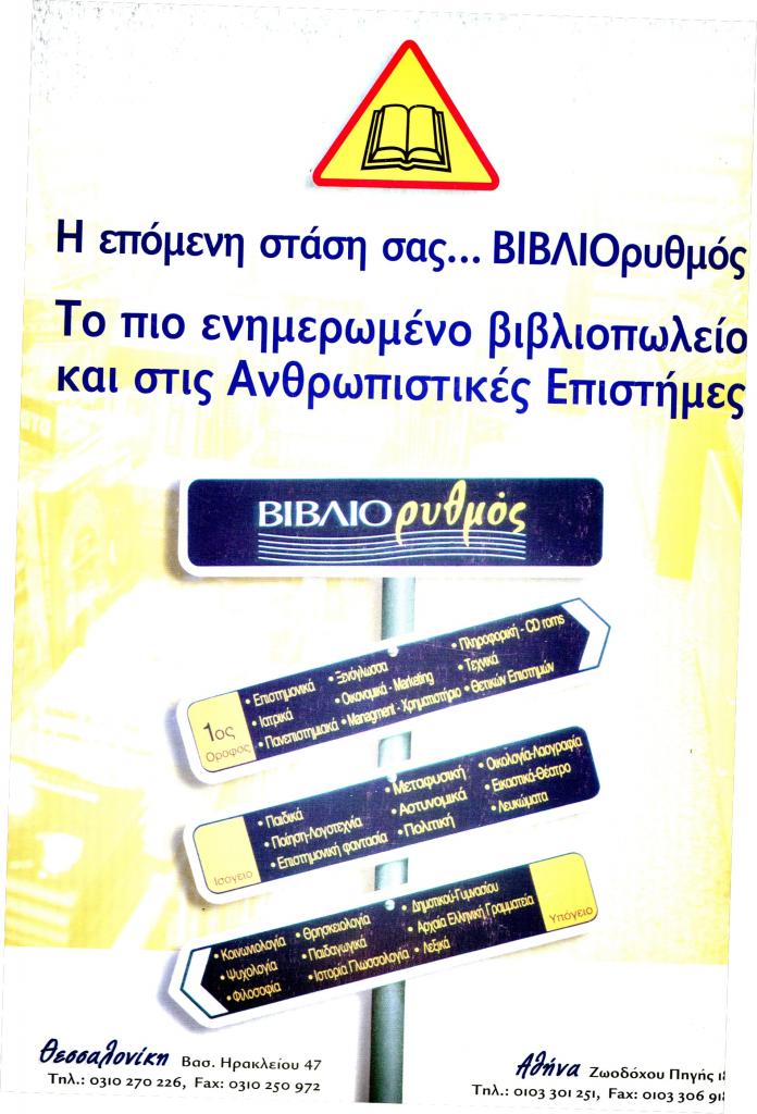 «Βιβλιορυθμός. Το πιο ενημερωμένο βιβλιοπωλείο και στις Ανθρωπιστικές Επιστήμες», Φιλόλογος, τχ. 109 (Φθινόπωρο 2002), σ. (οπισθόφυλλο)