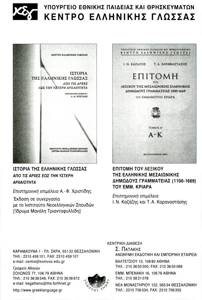 «Κέντρο Ελληνικής Γλώσσας. Ιστορία της ελληνικής γλώσσας. Από τις αρχές έως την ύστερη αρχαιότητα. Επιστημονική επιμέλεια Α.-Φ. Χριστίδης. Επιτομή του Λεξικού της μεσαιωνικής ελληνικής δημώδους γραμματείας 1100-1669 του Εμμανουήλ Κριαρά. Επιστημονική επιμέλεια Ι.Ν. Καζάζης και Τ.Α. Καραναστάσης», Φιλόλογος, τχ. 110 (Χειμώνας 2003), σ. 604