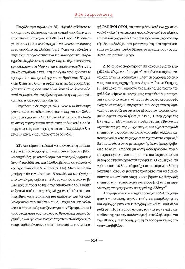 , «Βιβλιοπαρουσιάσεις. Το διδακτικό βιβλίο της Ιλιάδας από μετάφραση», Φιλόλογος, τχ. 110 (Χειμώνας 2003), σ. 620-627