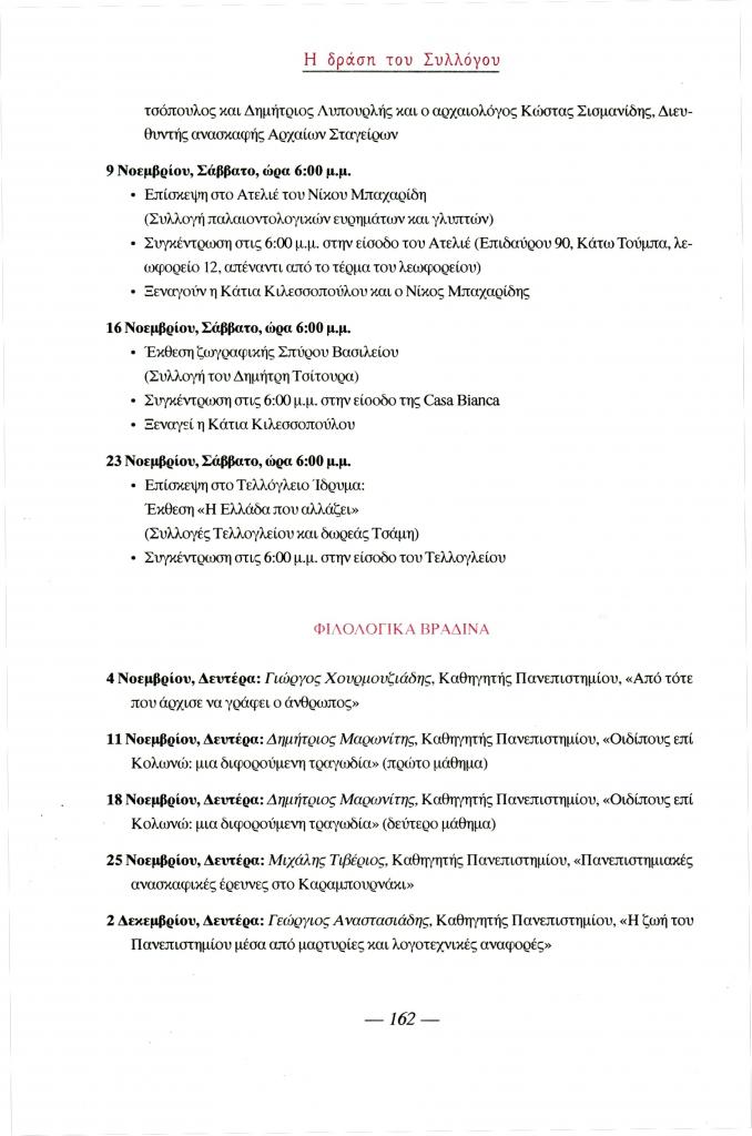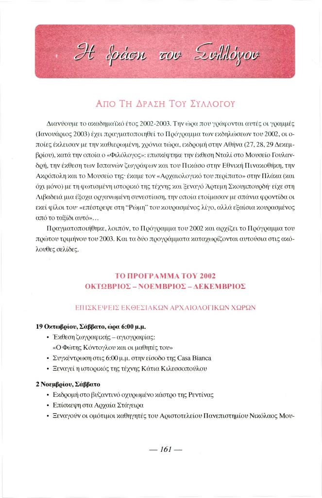 (ανυπόγραφο), «Η δράση του Συλλόγου. Από τη δράση του Συλλόγου: Το πρόγραμμα του 2002 Οκτώβριος – Νοέμβριος – Δεκέμβριος», Φιλόλογος, τχ. 111 (Άνοιξη 2003), σ. 161-163