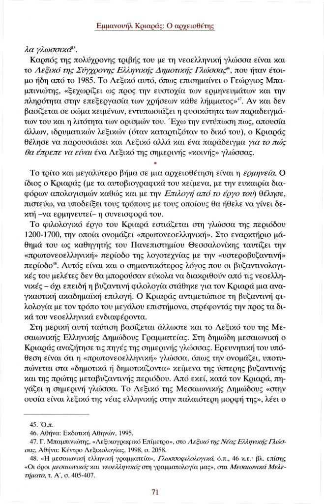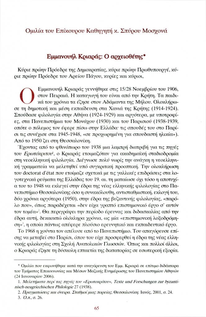 , «Εμμανουήλ Κριαράς: Ο αρχειοθέτης. Ομιλία του Επίκουρου Καθηγητή κ. Σπύρου Μοσχονά», Φιλόλογος, τχ. 123 (Ιανουάριος-Φεβρουάριος-Μάρτιος 2006), σ. 65-73
