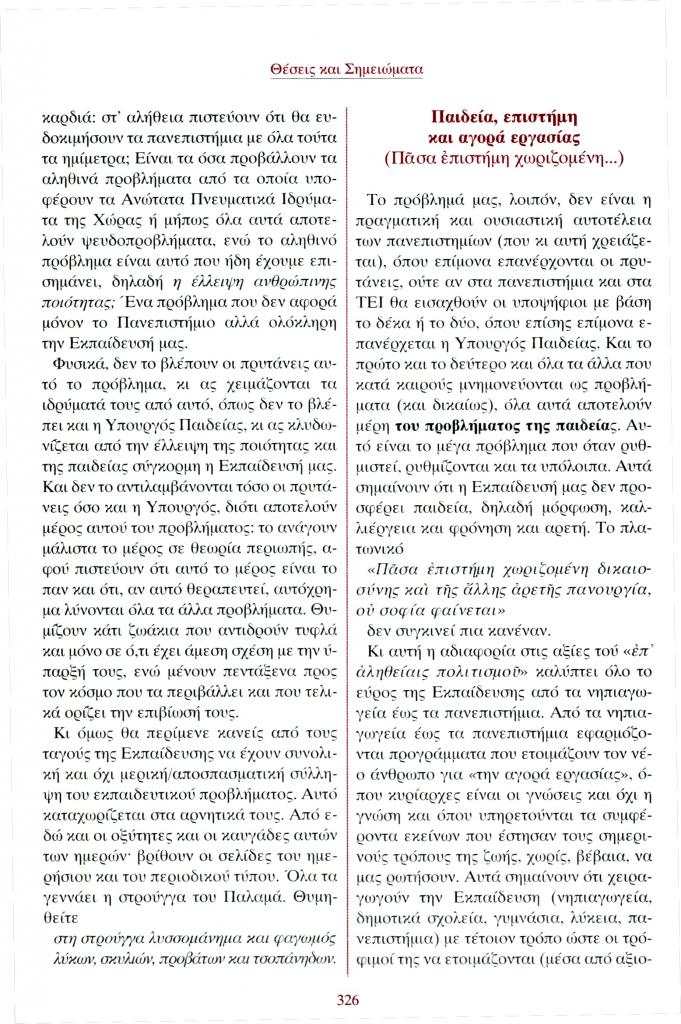 , «Θέσεις και σημειώματα. Απιστία. Η Θέτις, ο Αχιλλέας και ο Απόλλων ήτοι ο Κρόνος τρώει τα παιδιά του. Παιδεία, επιστήμη και αγορά εργασίας (Πάσα επιστήμη χωριζομένη…)», Φιλόλογος, τχ. 125 (Ιούλιος-Αύγουστος-Σεπτέμβριος 2006), σ. 326-327