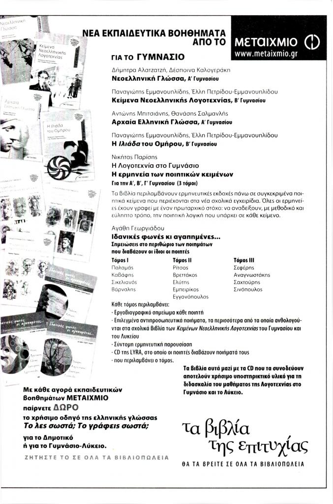 «Νέα εκπαιδευτικά βοηθήματα από το Μεταίχμιο», Φιλόλογος, τχ. 125 (Ιούλιος-Αύγουστος-Σεπτέμβριος 2006), σ. 462
