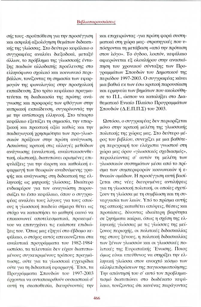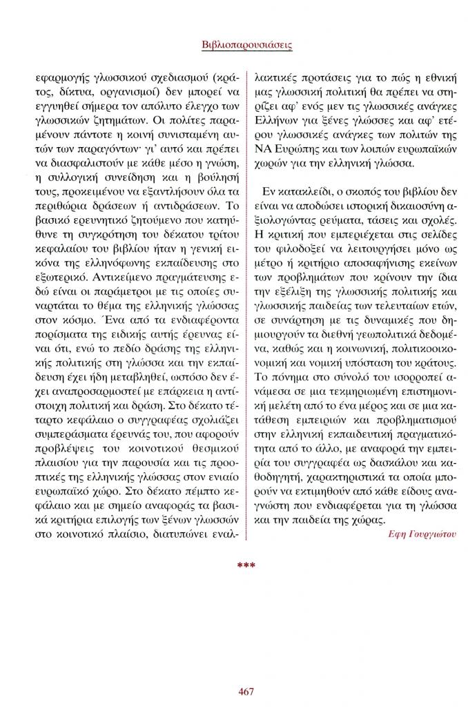 , «Βιβλιοπαρουσιάσεις. Χρίστος Α. Παπαρίζος, Γλωσσική πολιτική και γλωσσική παιδεία, Gutenberg 2004 – Γλωσσολογική βιβλιοθήκη 12, σελ. 300», Φιλόλογος, τχ. 125 (Ιούλιος-Αύγουστος-Σεπτέμβριος 2006), σ. 465-467