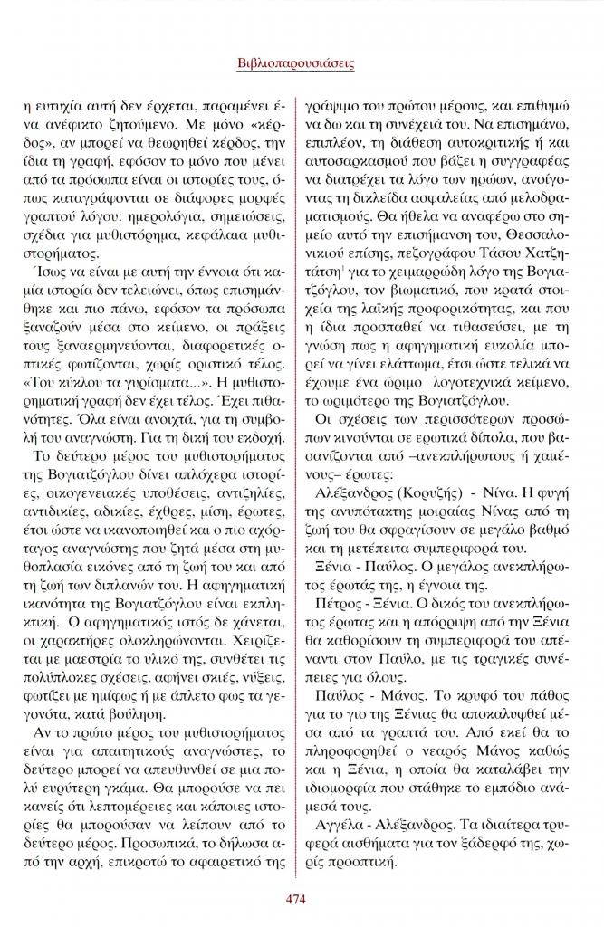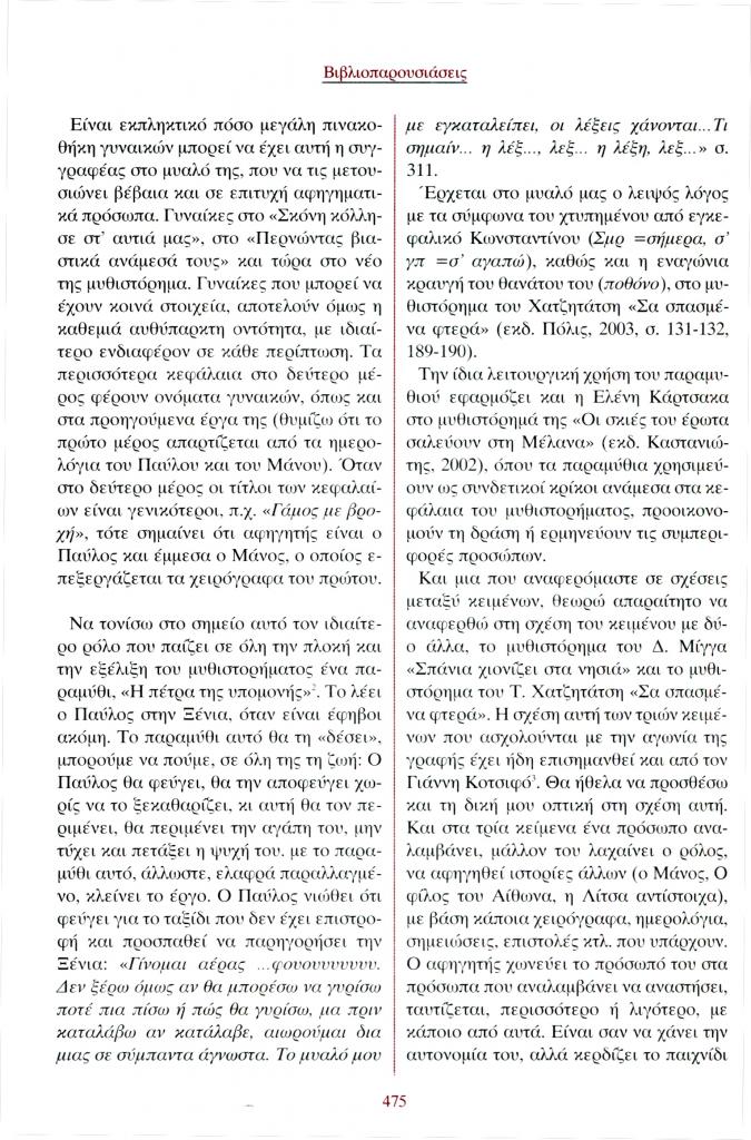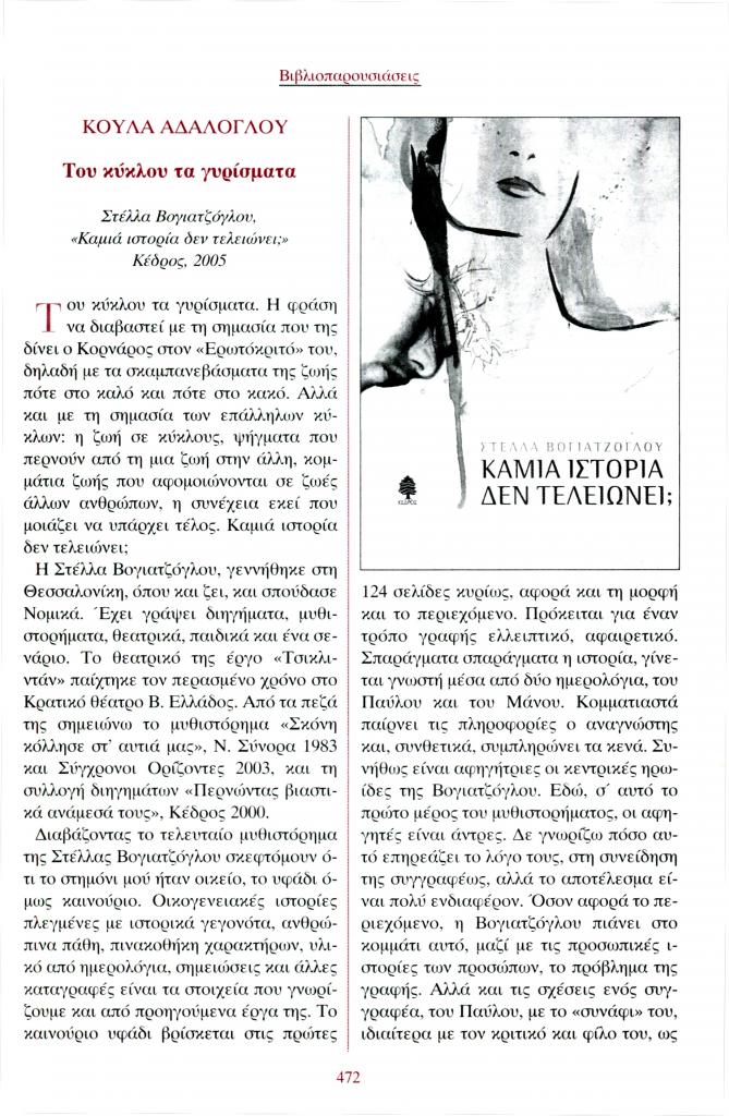 Αδαλόγλου Κυριακή, «Βιβλιοπαρουσιάσεις. Του κύκλου τα γυρίσματα. Στέλλα Βογιατζόγλου, Καμιά ιστορία δεν τελειώνει;, Κέδρος, 2005», Φιλόλογος, τχ. 125 (Ιούλιος-Αύγουστος-Σεπτέμβριος 2006), σ. 472-476