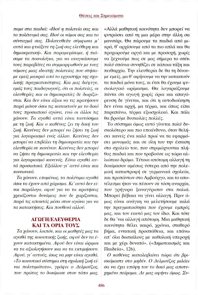, «Θέσεις και σημειώματα. Σχολική ζωή και σχολείων καταλήψεις. Σχολικοί όμιλοι η νέα ελπίδα. Πού οι ρυθμοί και πού οι κανόναρχοι;», Φιλόλογος, τχ. 126 (Οκτώβριος-Νοέμβριος-Δεκέμβριος 2006), σ. 485-486