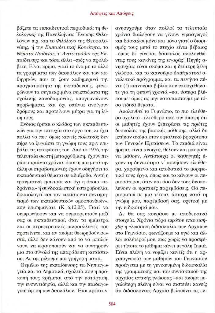 (ανυπόγραφο), «Απόψεις και απόψεις. Έξι ανεπίδοτα γράμματα στην Υπουργό Παιδείας. Τρίτο γράμμα, για την Υποχρεωτική Εκπαίδευση», Φιλόλογος, τχ. 126 (Οκτώβριος-Νοέμβριος-Δεκέμβριος 2006), σ. 503-505
