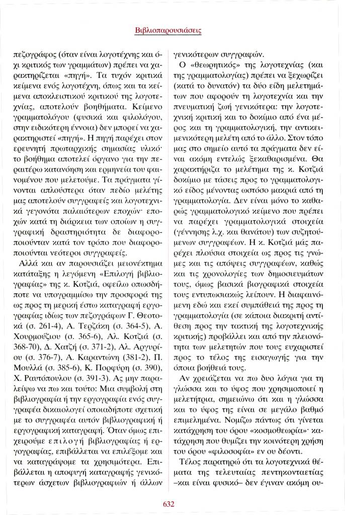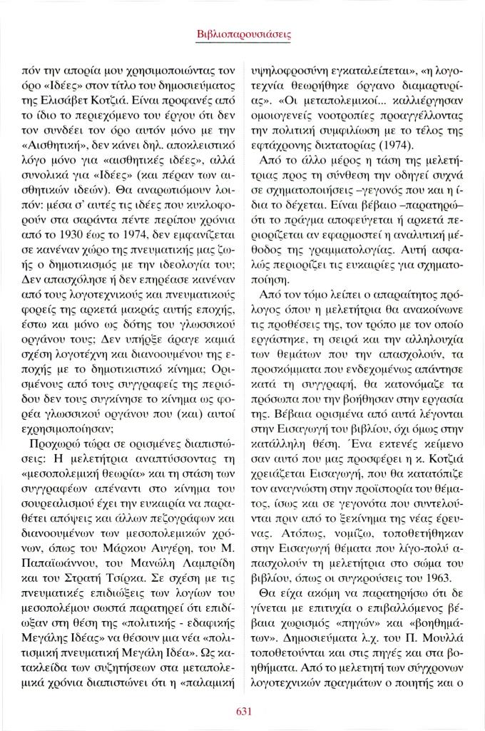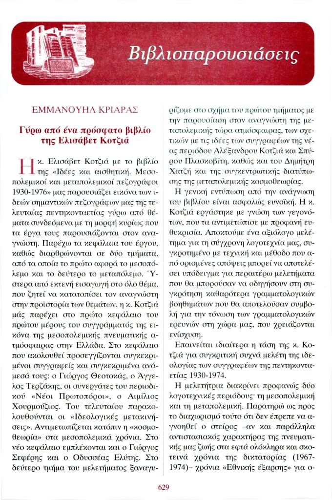 Κριαράς Εμμανουήλ, «Βιβλιοπαρουσιάσεις. Γύρω από ένα πρόσφατο βιβλίο της Ελισάβετ Κοτζιά», Φιλόλογος, τχ. 126 (Οκτώβριος-Νοέμβριος-Δεκέμβριος 2006), σ. 629-633