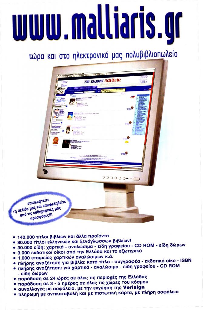 «www.malliaris.gr Τώρα και στο ηλεκτρονικό μας πολυβιβλιοπωλείο», Φιλόλογος, τχ. 126 (Οκτώβριος-Νοέμβριος-Δεκέμβριος 2006), σ. (έσω οπισθόφυλλο)