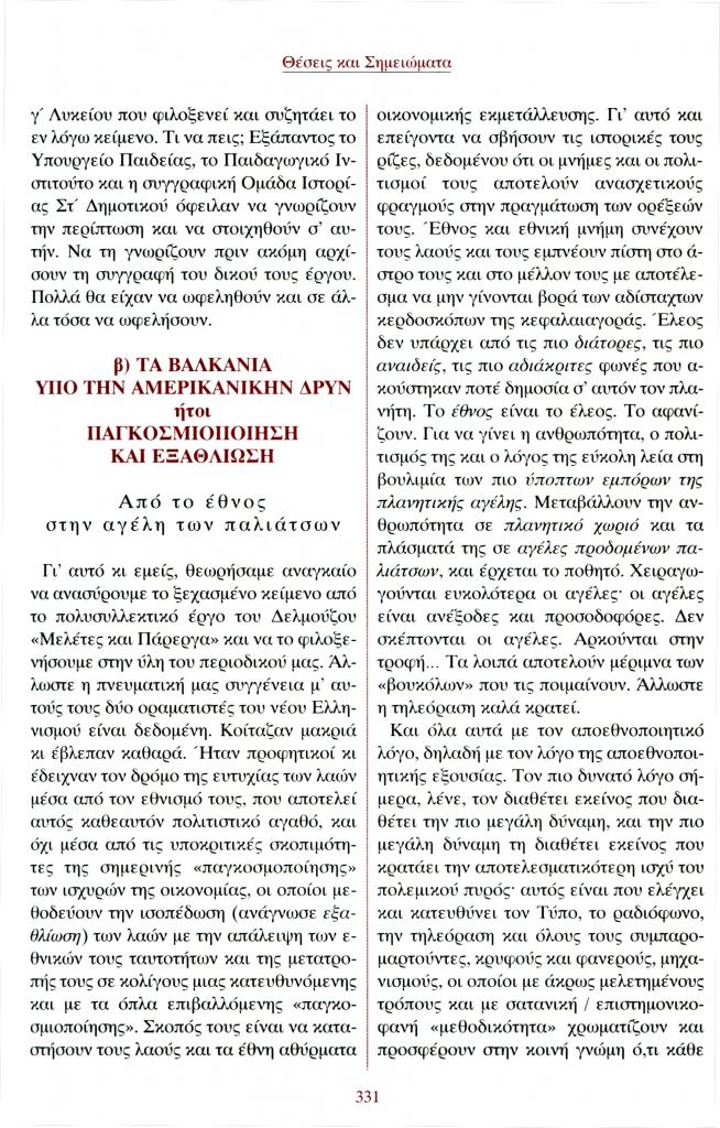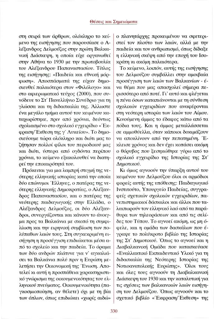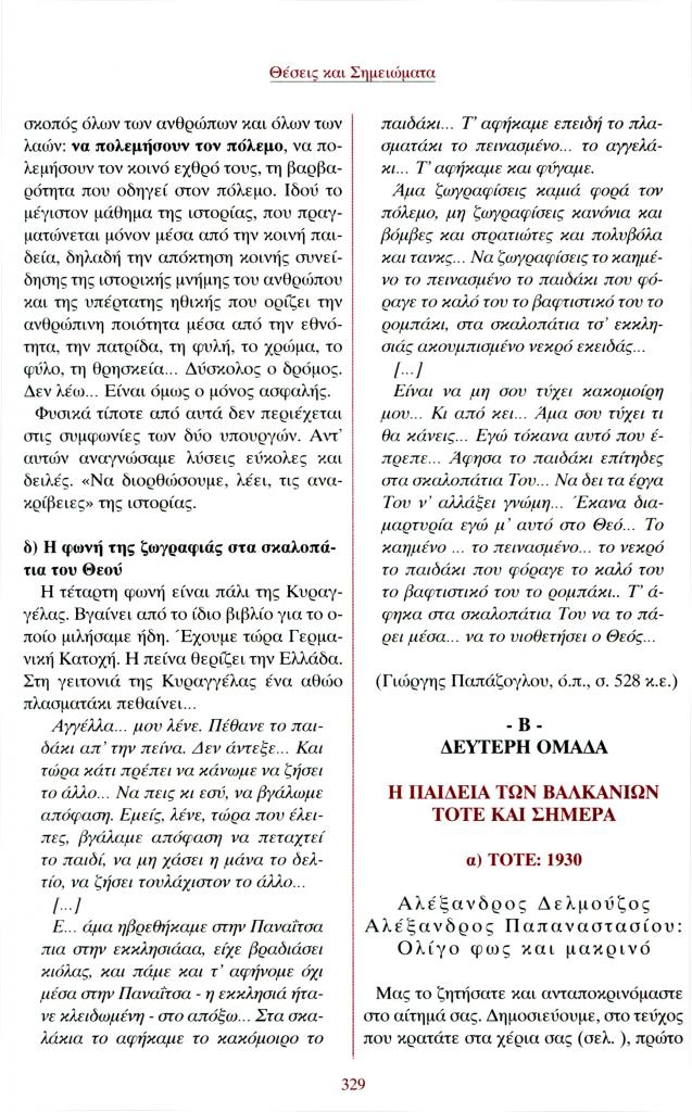 , «Θέσεις και σημειώματα. Παρακαταθήκη παιδείας η ιστορία ή μήπως εφήμερος γλυκασμός; (πόνος πόνων πόνον φέρει). Β. Δεύτερη ομάδα. Η παιδεία των Βαλκανίων τότε και σήμερα α) Τότε: 1930», Φιλόλογος, τχ. 129 (Ιούλιος-Αύγουστος-Σεπτέμβριος 2007), σ. 329-331