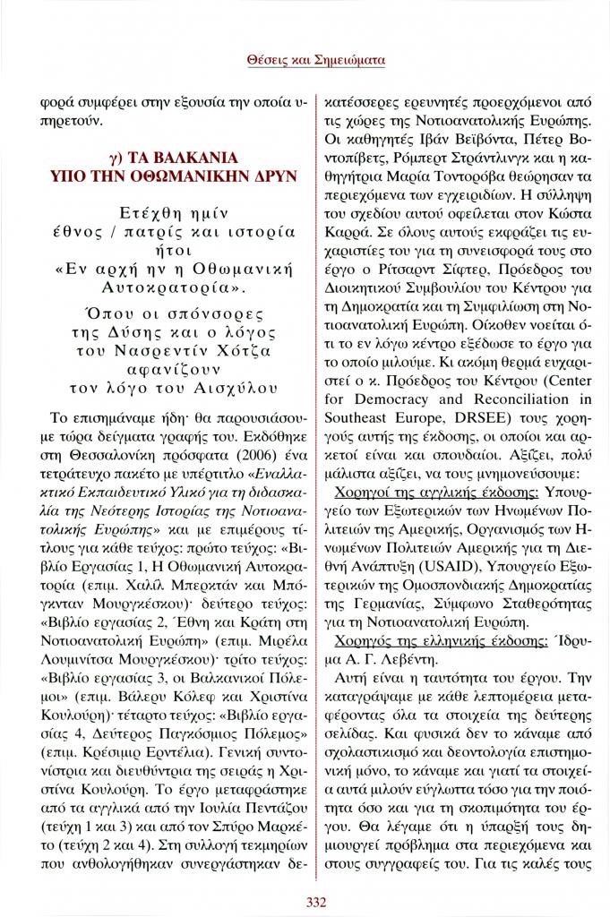 , «Θέσεις και σημειώματα. Παρακαταθήκη παιδείας η ιστορία ή μήπως εφήμερος γλυκασμός; (πόνος πόνων πόνον φέρει). Β. Δεύτερη ομάδα. Η παιδεία των Βαλκανίων τότε και σήμερα β) Τα Βαλκάνια υπό την αμερικανικήν δρυν ήτοι παγκοσμιοποίηση και εξαθλίωση», Φιλόλογος, τχ. 129 (Ιούλιος-Αύγουστος-Σεπτέμβριος 2007), σ. 331-332