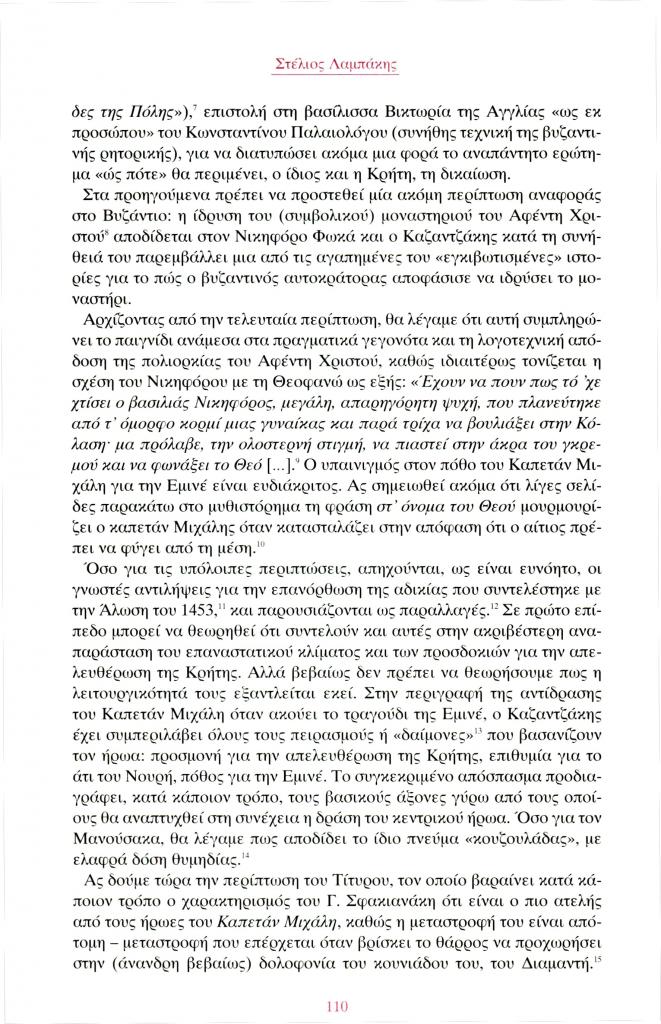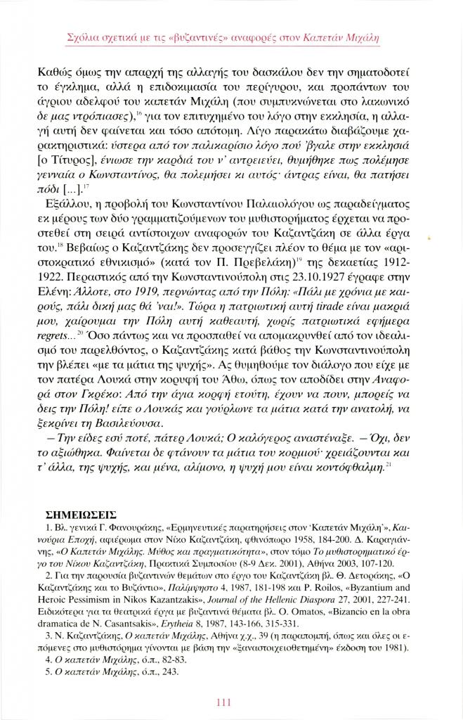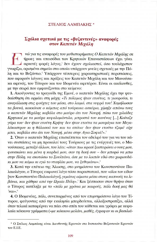 , «Σχόλια σχετικά με τις βυζαντινές αναφορές στον Καπετάν Μιχάλη», Φιλόλογος, τχ. 131 (Ιανουάριος-Φεβρουάριος-Μάρτιος 2008), σ. 109-113