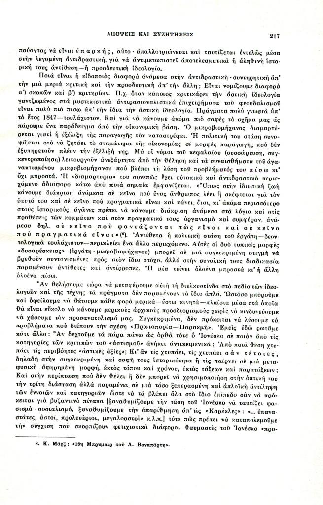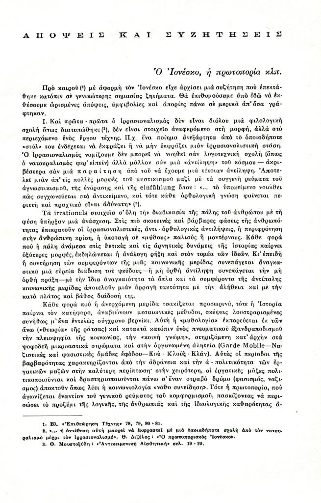 , «Απόψεις και συζητήσεις. Ο Ιονέσκο, η πρωτοπορία κλπ.», Κριτική, τόμ. 3, τχ. 17-18 (Σεπτέμβριος-Δεκέμβριος 1961), σ. 215-218