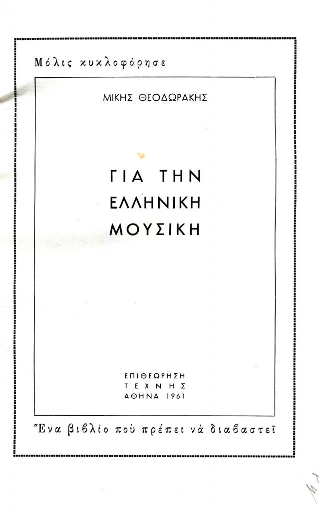 «Μίκης Θεοδωράκης Για την ελληνική μουσική Επιθεώρηση Τέχνης Αθήνα 1961», Κριτική, τόμ. 3, τχ. 17-18 (Σεπτέμβριος-Δεκέμβριος 1961), σ. (έσω οπισθόφυλλο)