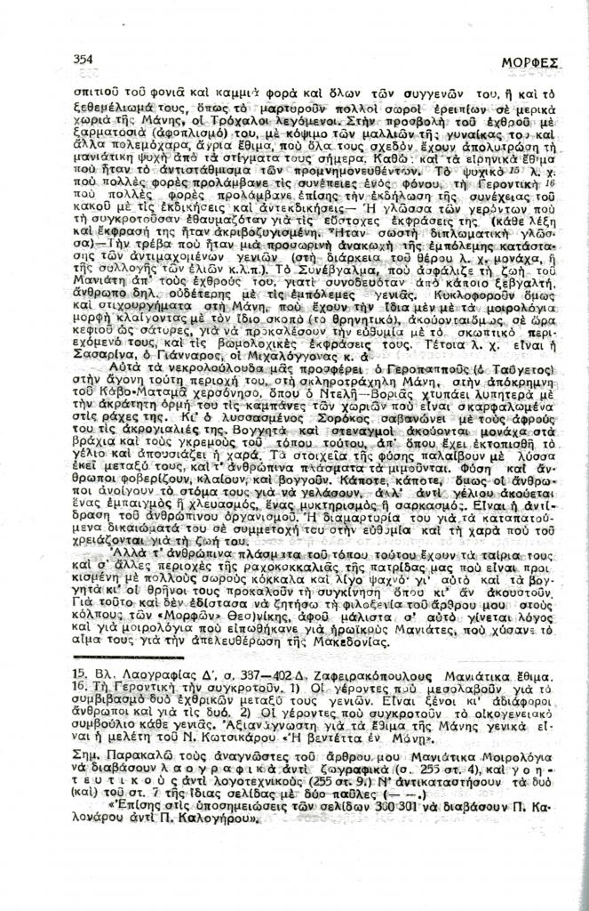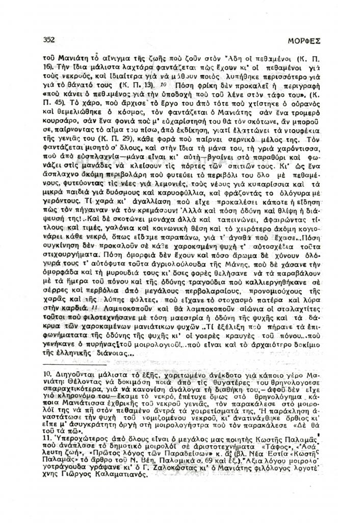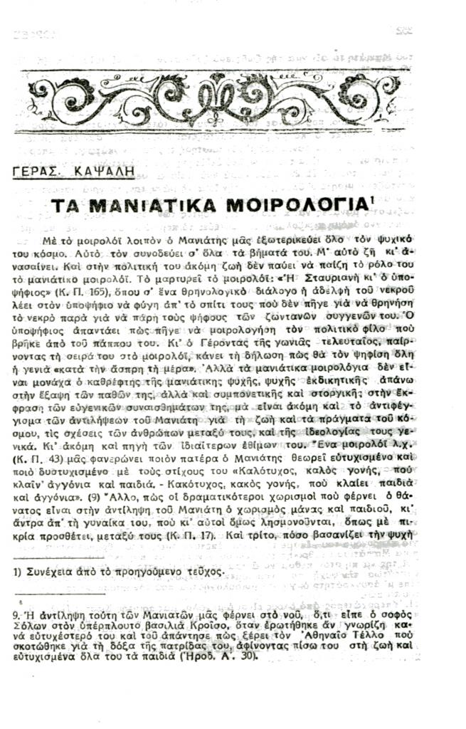 Καψάλης Γεράσιμος, «Τα μανιάτικα μοιρολόγια», Μορφές, τχ. 21 (Ιούνιος 1948), σ. 351-354