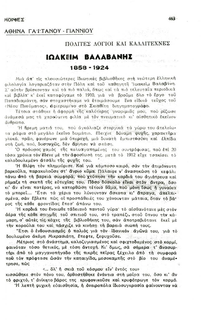 Γαϊτάνου-Γιαννιού Αθηνά, «Πολίτες λόγιοι και καλλιτέχνες. Ιωακείμ Βαλαβάνης. 1858-1924», Μορφές, τχ. 24 (Σεπτέμβριος 1948), σ. 463-468