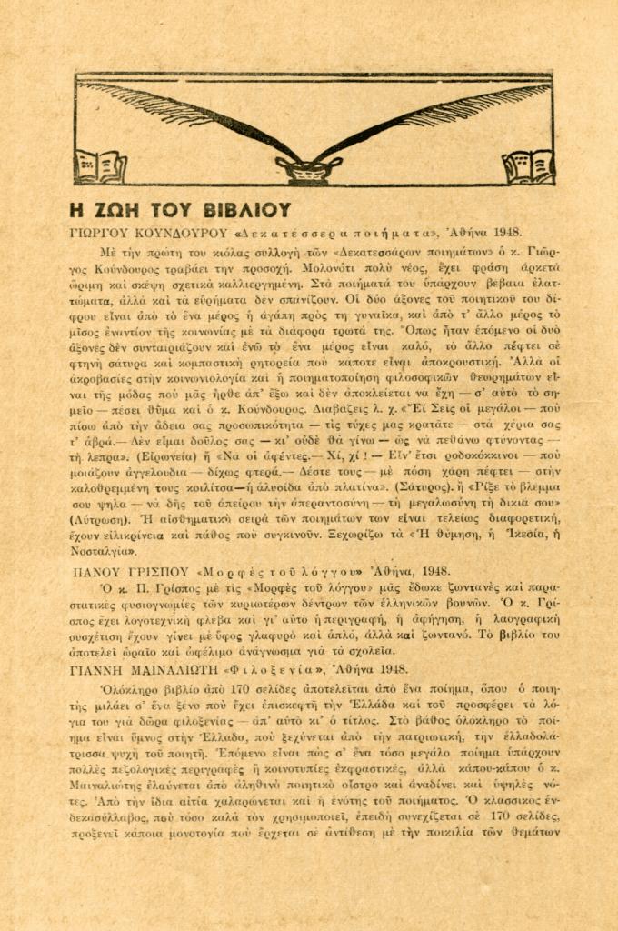 , «Η ζωή του βιβλίου. Γιώργου Κούνδουρου, Δεκατέσσερα ποιήματα, Αθήνα 1948», Μορφές, τχ. 27 (Δεκέμβριος 1948), σ. 112