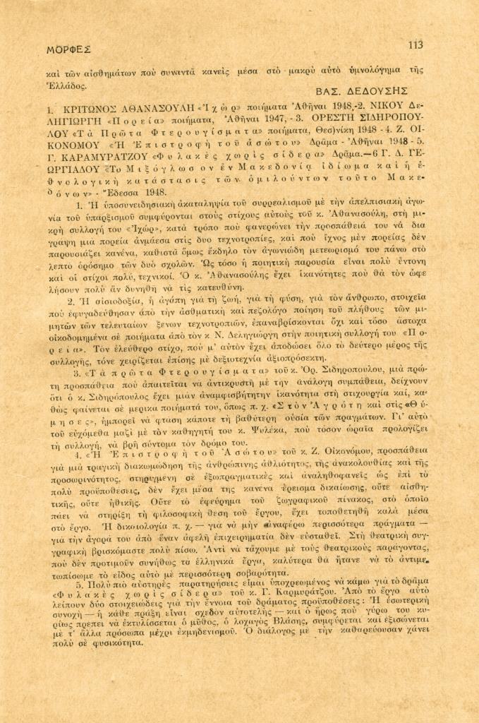 Δεδούσης Βασίλειος, «Η ζωή του βιβλίου. Γιάννη Μαιναλιώτη, Φιλοξενία, Αθήνα 1948», Μορφές, τχ. 27 (Δεκέμβριος 1948), σ. 112-113
