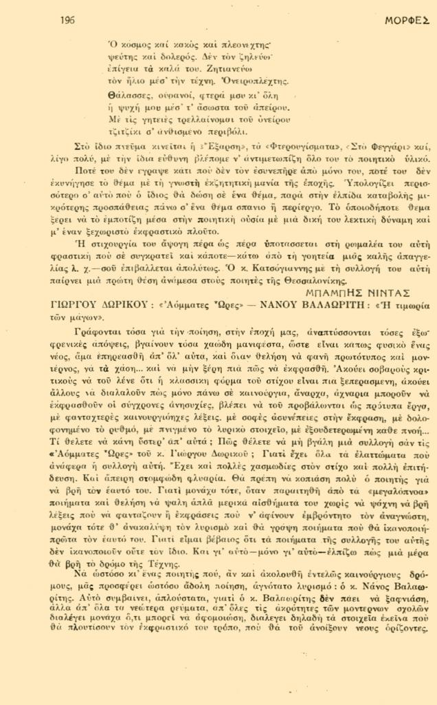 , «Η ζωή του βιβλίου. Γιώργου Δωρικού: Αόμματες ώρες – Νάνου Βαλαωρίτη: Η τιμωρία των μάγων», Μορφές, τχ. 29 (Φεβρουάριος 1949), σ. 196-197