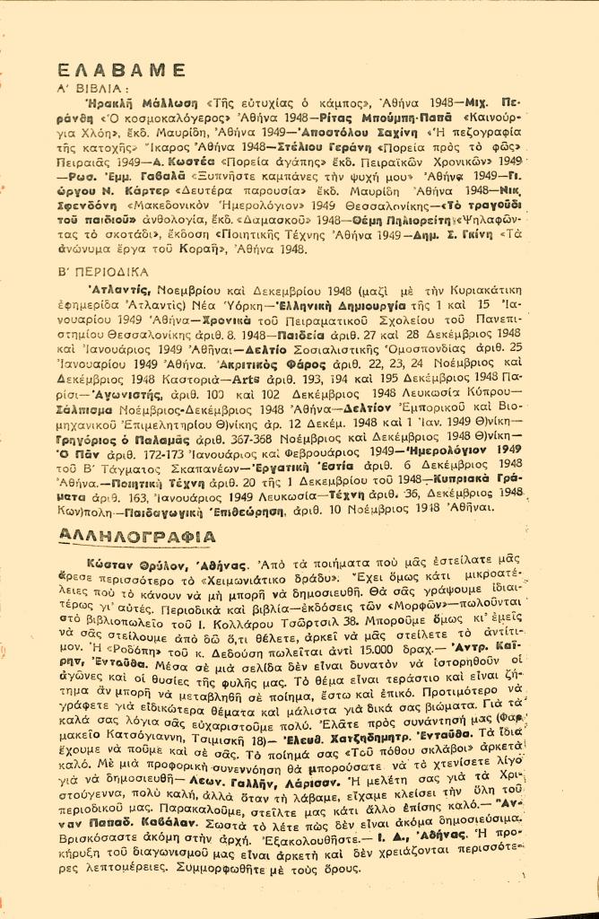 «Ελάβαμε», Μορφές, τχ. 29 (Φεβρουάριος 1949), σ. (έσω οπισθόφυλλο)