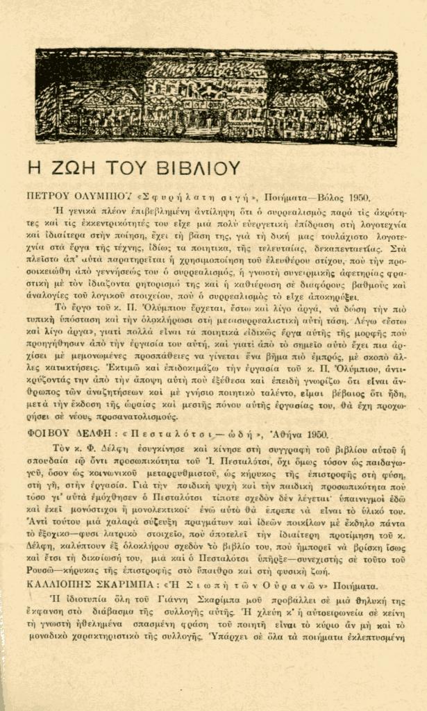 , «Η ζωή του βιβλίου. Πέτρου Ολυμπίου Σφυρήλατη σιγή, Ποιήματα, Βόλος 1950», Μορφές, τχ. 52-53 (Ιανουάριος-Φεβρουάριος 1951), σ. 43