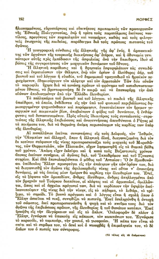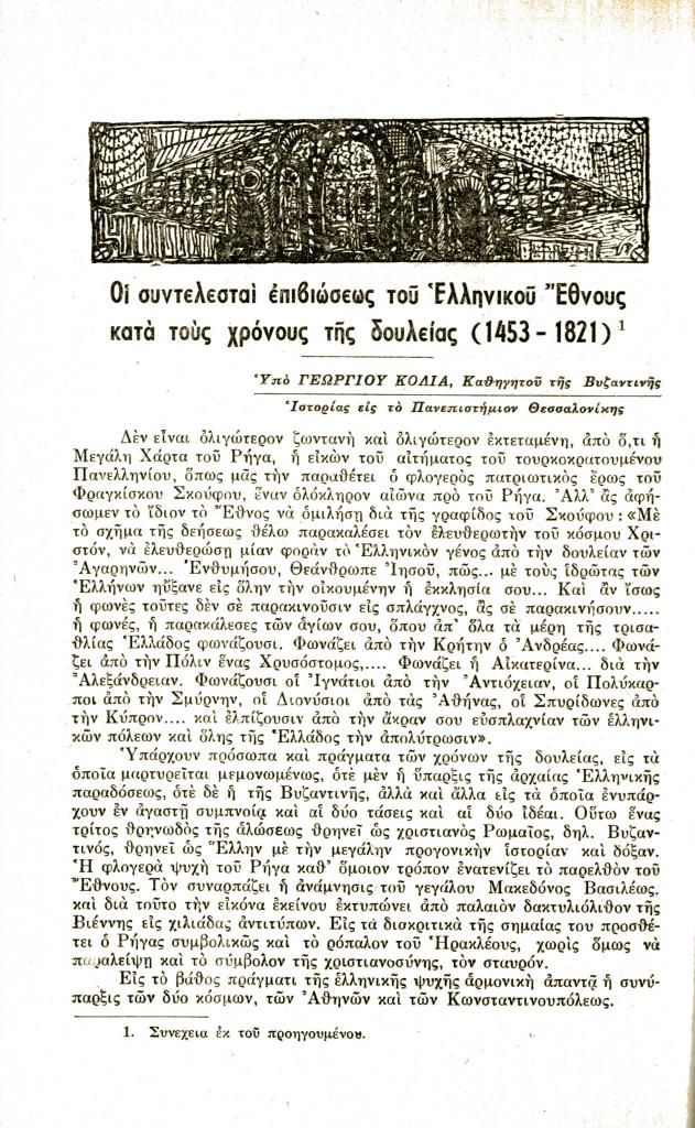 Κόλιας Γεώργιος, «Οι συντελεσταί επιβιώσεως του Ελληνικού Έθνους κατά τους χρόνους της δουλείας (1453-1821)», Μορφές, τχ. 59 (Αύγουστος 1951), σ. 190-192