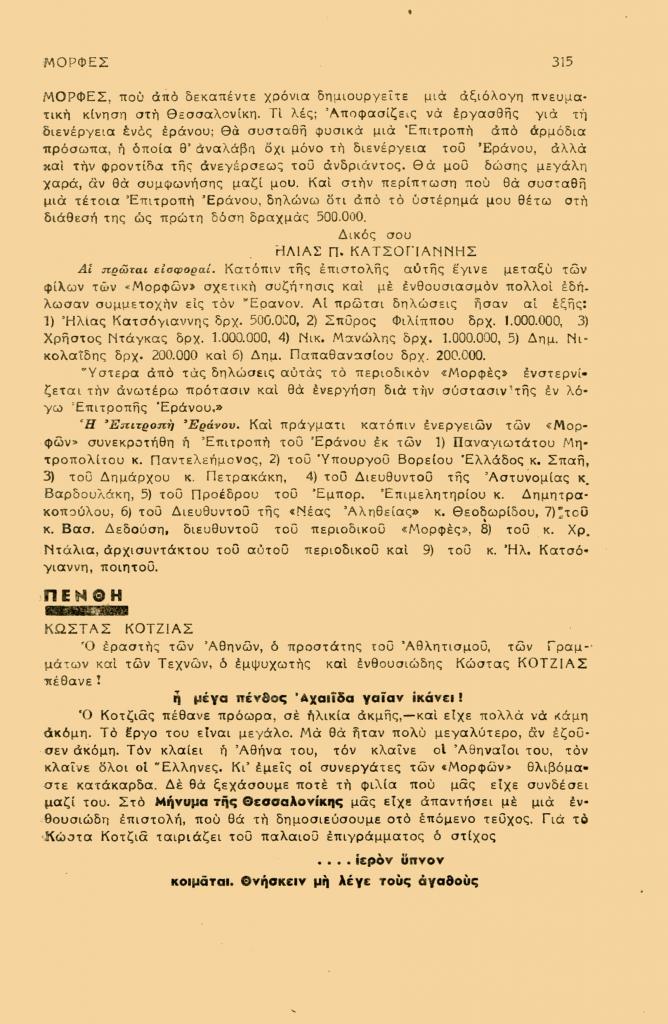 (ανυπόγραφο), «Πένθη. Κώστας Κοτζιάς», Μορφές, τχ. 63 (Δεκέμβριος 1951), σ. 315