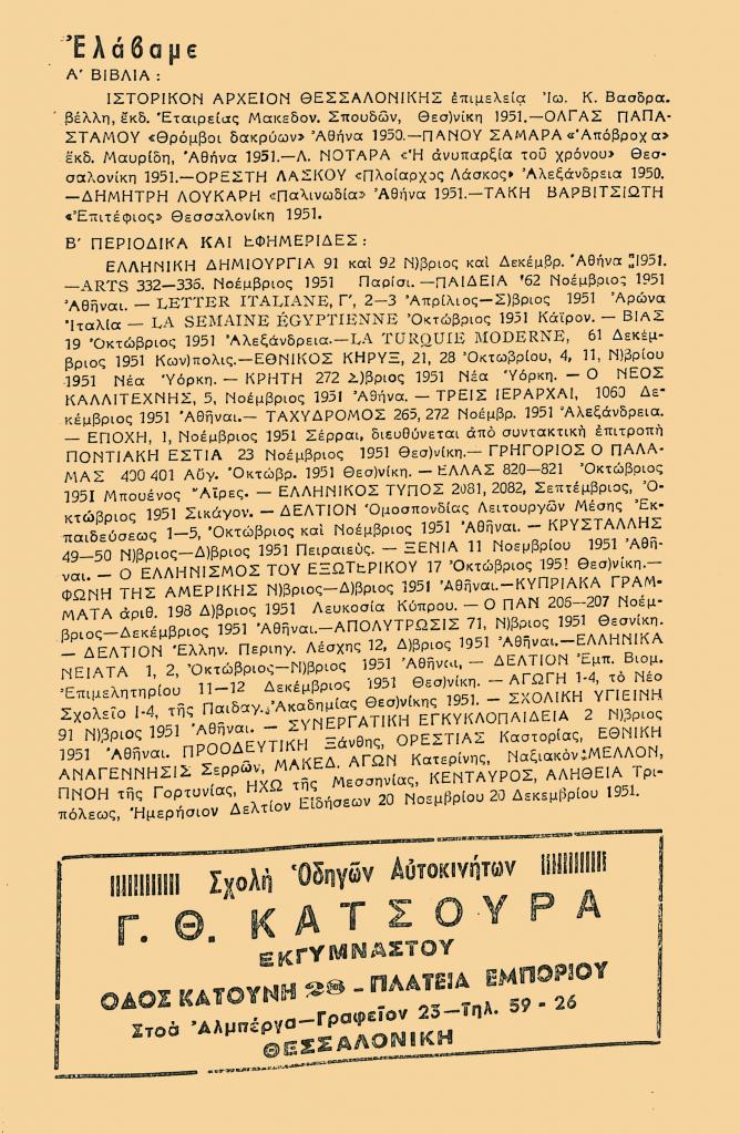 «Σχολή Οδηγών Αυτοκινήτων Γ.Θ. Κατσούρα», Μορφές, τχ. 63 (Δεκέμβριος 1951), σ. (έσω οπισθόφυλλο)