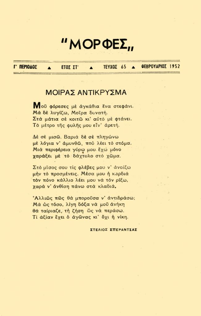 Σπεράντσας Στέλιος, «Μοίρας αντίκρυσμα», Μορφές, τχ. 65 (Φεβρουάριος 1952), σ. 35