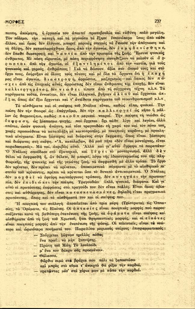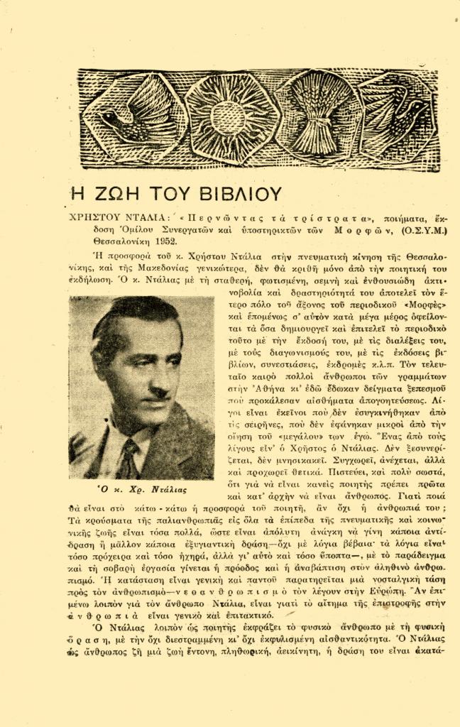, «Η ζωή του βιβλίου. Χρήστου Ντάλια, Περνώντας τα τρίστρατα, ποιήματα, έκδοση Ομίλου Συνεργατών και υποστηρικτών των Μορφών (Ο.Σ.Υ.Μ.), Θεσσαλονίκη 1952», Μορφές, τχ. 72 (Σεπτέμβριος 1952), σ. 236-238