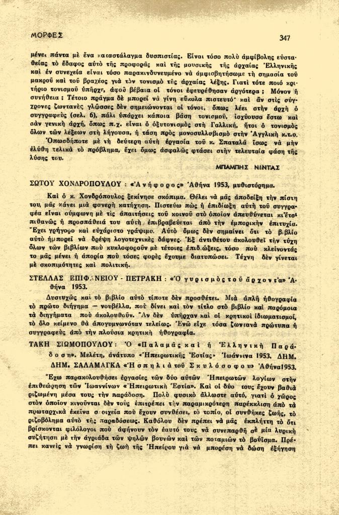 , «Η ζωή του βιβλίου. Στέλλας Επιφανίου-Πετράκη: Ο γυρισμός του άρχοντα Αθήνα 1953», Μορφές, τχ. 87-88-89 (Ιανουάριος-Φεβρουάριος 1953), σ. 347