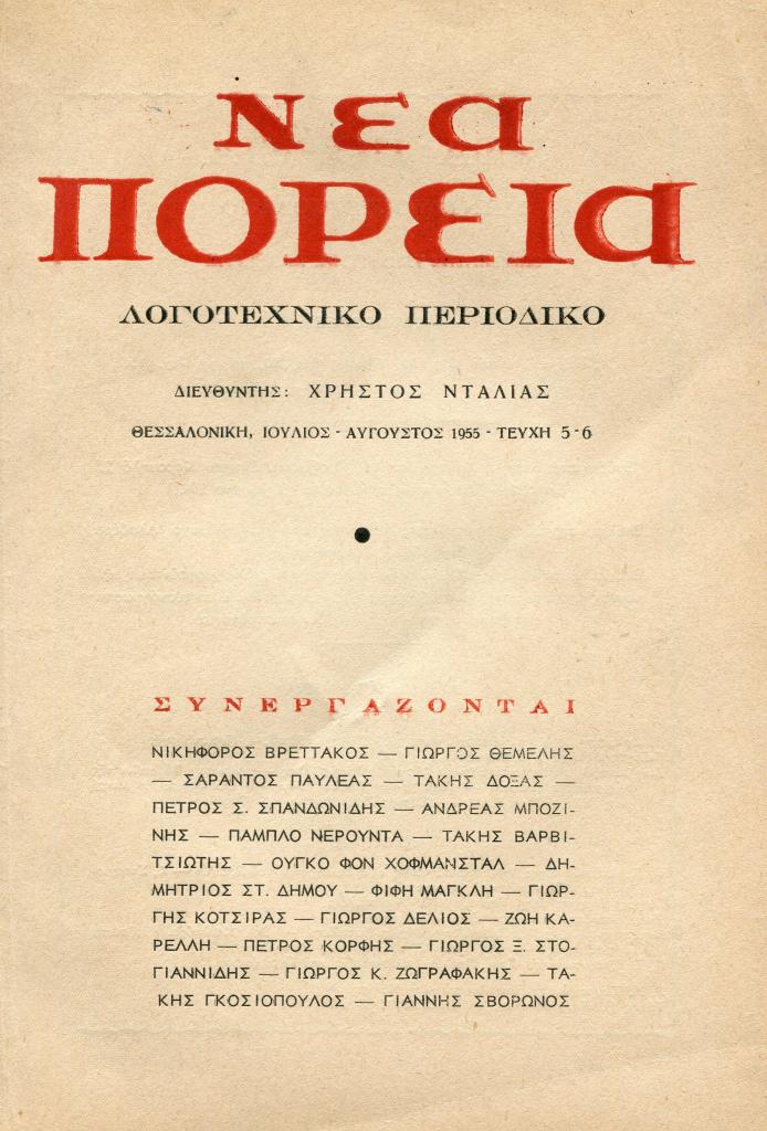 «Εξώφυλλο», Νέα Πορεία, τόμ. 1, τχ. 5-6 (Ιούλιος-Αύγουστος 1955), σ. (εξώφυλλο)