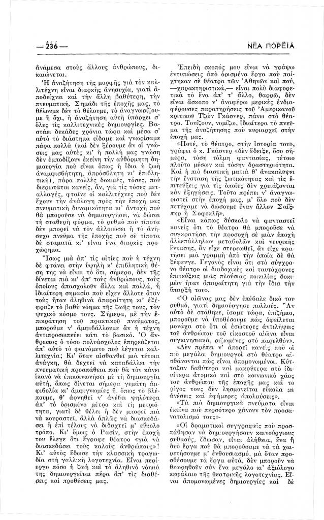, «Το θέατρο. Λόπε ντε Βέγκα, Αστέρι της Σεβίλλης, Λόρκα, Το Σπίτι της Μπερνάντα Άλμπα, Ρουσέν, Η Ωραία Ελένη, Ουάιλντερ, Η Μικρή μας Πόλη και Με τα δόντια, Σαρτρ, Κεκλεισμένων των θυρών», Νέα Πορεία, τόμ. 1, τχ. 5-6 (Ιούλιος-Αύγουστος 1955), σ. 235-241