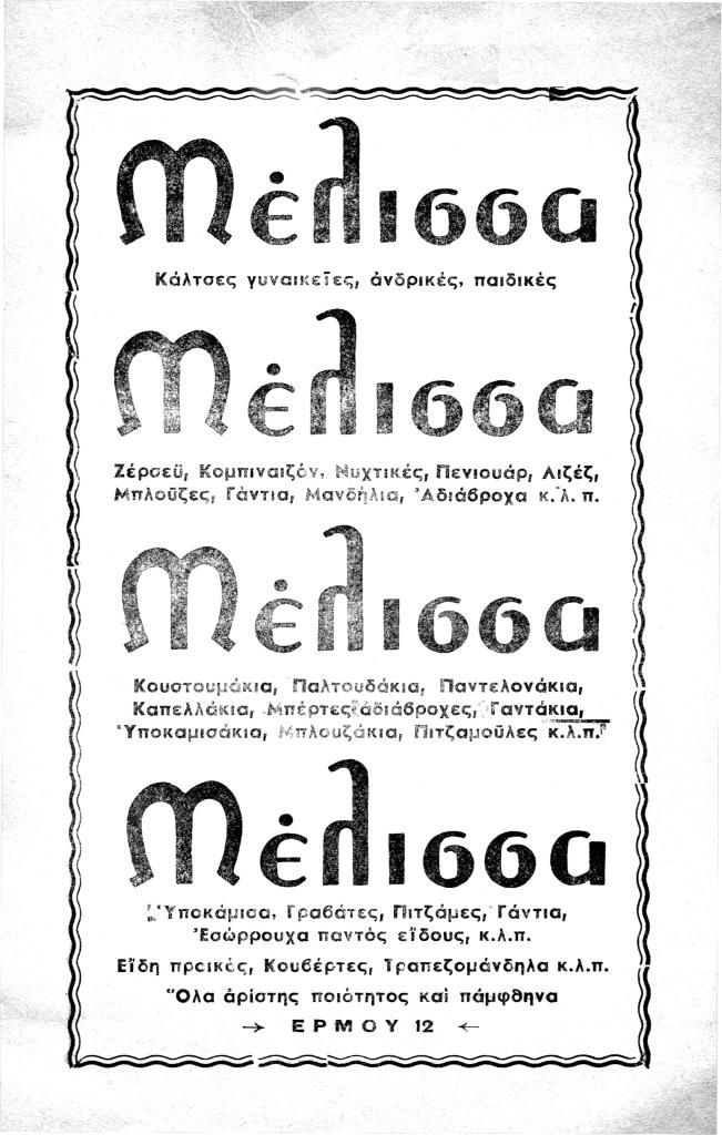 «Μέλισσα», Νέα Πορεία, τόμ. 1, τχ. 9-10 (Νοέμβριος-Δεκέμβριος 1955), σ. (έσω οπισθόφυλλο)